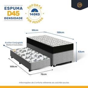 - Dimensões do produto (larg. x comp. x alt.) Solteiro: 88x188x45cm;