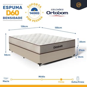 Complementando este colchão, a caixa base é feita de madeira tratada e revestida, suportando até 150 Kg por pessoa. Ela não só eleva seu colchão a uma altura ideal para fácil acesso, mas também estabiliza seu sono com uma base sólida e confiável. Esta combinação não apenas maximiza seu conforto, mas também a funcionalidade de seu espaço de descanso.