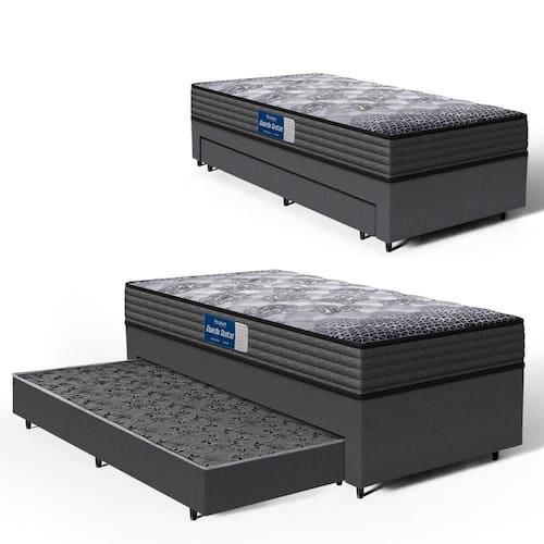 E que tal a base com cama auxiliar integrada? A base bicama inclui uma cama auxiliar fixa com molas ensacadas, proporcionando um suporte firme e ortopédico, ideal para quem precisa de um apoio adicional. A cama oferece uma solução prática para otimizar o uso do espaço, facilitando o acesso e o conforto no quarto.