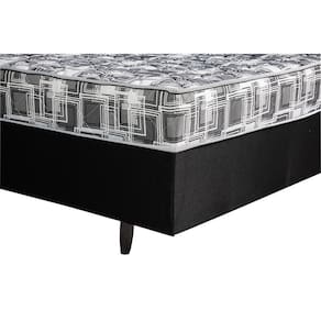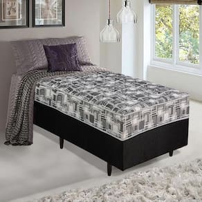Caracteristicas: Molejo estrutural com molas ensacadas de arame de aco, bitola 1,70 mm, media de 199 molas/m Estrutura em caixa de madeira de eucalipto com 32 cm de altura Suporte medio de 150 kg/m Estrutura suporta ate 90 kg Tampo bordado com espuma flexivel D-26 kg/m, TNT e fibra de poliester 150 g/m Tecido faixa bordado com espuma flexivel D-20 kg/m e TNT Revestimento em poliester e TNT Produzido conforme protocolos de qualidade do INMETRO