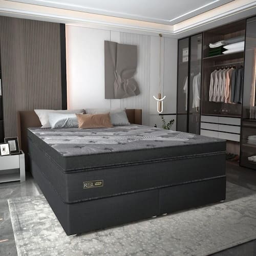 A Cama Box Conjugado King (193x78x203) Molas Royal Black Gazin CR35300 é a escolha ideal para quem busca luxo, conforto e durabilidade. Seu colchão combina Matelassê, Hiper Soft e Fibra Siliconada, proporcionando uma sensação acolchoada e extremamente macia. A fibra siliconada é aveludada, antialérgica e higiênica, garantindo noites de sono mais saudáveis. Com espuma D33 e espuma HR de alta resiliência, o Royal Black oferece suporte firme e recuperação rápida da forma autêntico, proporcionando um sono contínuo e confortável. A espuma Hiper Soft adiciona uma textura suave e aveludada, criando a sensação de deitar em uma nuvem. A estrutura conta com molas ensacadas Bluewave 2.0, que oferecem suporte individualizado, absorvem os movimentos e eliminam ruídos. Com borda estabilizadora, o colchão mantém sua forma e suporte ao longo dos anos, suportando pesos de até 170 kg. O design sofisticado é complementado por uma lateral em tecido linho, que confere resistência e um visual elegante. A base, feita de madeira de reflorestamento, garante durabilidade e sustentabilidade. Seu revestimento lateral em malha suede adiciona um toque sofisticado e moderno ao ambiente.