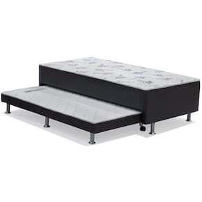 Conjugado Cama Cori Nero Vazado possui um Colchão acoplado a a Cama, além de uma cama extra para acomodadar suas visitas que pode ser guardada dentro do Box quando não está sendo utilizada. É composto 100% com madeira de reflorestamento, preocupação da Ortobom com o meio ambiente. Seu revestimento é em Sintético Preto. A Cama acompanha jogo de pés em PVC. Combinação perfeita de Modernidade e Praticidade em um só produto. CARACTERÍSTICAS