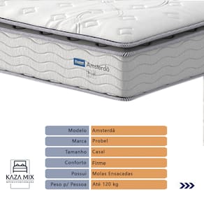 O conforto que sua casa precisa e a qualidade que você merece está na Kazamix! Colchão Probel Amsterdã – a escolha perfeita para noites de sono inigualáveis. Equipado com Molas Ensacadas Prolastic, oferece suporte individualizado, reduzindo a transferência de movimentos para um descanso mais tranquilo. Seu Pillow Top Super proporciona uma camada extra de maciez, elevando o conforto e garantindo uma experiência de luxo. Com camadas de espuma D33 e D65, o Amsterdã combina firmeza e durabilidade, enquanto as proteções antiácaro, antialérgico e antifungo criam um ambiente de sono saudável. Invista em qualidade e bem-estar com o Colchão Probel Amsterdã e transforme suas noites. Modelo: Amsterdã Marca: Probel Tamanho: Casal Dimensões: 138x188X34 (Largura x Comprimento x Altura) Conforto: Firme Sistema: Molas Ensacadas Pillow: Pillow Top Peso Máximo recomendado: 120 kg (Por pessoa) Proteções: Antiácaro, antialérgico, antifungo, antimofo Garantia: 1 ano pelo FabricanteO conforto que sua casa precisa e a qualidade que você merece está na Kazamix! Eleve o conforto e a sofisticação do seu quarto com a Cama Box! Produzida em madeira de reflorestamento reforçada, a Cama Box combina qualidade, durabilidade e um design elegante, que confere leveza e modernidade ao seu dormitório. Sua estrutura robusta suporta até 150 kg por pessoa, garantindo a sustentação perfeita para o colchão e prolongando a vida útil do produto. Com uma altura ergonômica, ela oferece maior conforto ao deitar e levantar, enquanto o acabamento de alta qualidade se adapta a qualquer estilo de decoração, unindo praticidade e estilo. Não perca tempo! Adquira agora mesmo a sua Cama Box e transforme seu dormitório com conforto e elegância. Marca: KazaMix Modelo: Box Tamanho: Casal Dimensões: 138X188X35 (Largura x Comprimento x Altura) Estrutura: Madeira Peso máximo recomendado: 150 kg (Por Pessoa) Altura do Box: 25 cm Altura dos Pés: 10 cm Altura total: 35 cm Garantia: 03 meses Selo Ecologicamente Correto Atenção: Antes de finalizar sua compra, certifique-se de que as dimensões do produto sejam adequadas para serem transportadas pelos elevadores, portas, escadas e corredores de sua residência. Ressaltamos que não nos responsabilizamos pelo transporte do produto por meios específicos, como escadas, guinchos ou içamentos.