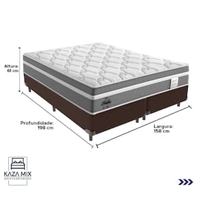 O conforto que sua casa precisa e a qualidade que você merece está na Kazamix! Apresentamos o Colchão Probel Berlim, a escolha ideal para quem busca conforto e qualidade. Com Molas Ensacadas e camada Euro Pillow, ele proporciona suporte individualizado e maciez extra para um sono tranquilo. A espuma D28 oferece durabilidade e conforto, enquanto o tecido em malha e jacquard garante um toque sofisticado e respirabilidade. Além disso, conta com proteções antiácaro e antialérgico, criando um ambiente saudável para o seu descanso. Invista no seu conforto com o Colchão Probel Berlim! Modelo: Berlim Marca: Probel Tamanho: Queen Dimensões: 158x198X26 (Largura x Comprimento x Altura) Conforto: Intermediário Sistema: Molas Ensacadas Pillow: Euro Pillow Peso Máximo recomendado: 110 kg (Por pessoa) Proteções: Antiácaro, antialérgico, antifungo, antimofo Garantia: 1 ano pelo FabricanteO conforto que sua casa precisa e a qualidade que você merece está na Kazamix! Eleve o conforto e a sofisticação do seu quarto com a Cama Box! Produzida em madeira de reflorestamento reforçada, a Cama Box combina qualidade, durabilidade e um design elegante, que confere leveza e modernidade ao seu dormitório. Sua estrutura robusta suporta até 150 kg por pessoa, garantindo a sustentação perfeita para o colchão e prolongando a vida útil do produto. Com uma altura ergonômica, ela oferece maior conforto ao deitar e levantar, enquanto o acabamento de alta qualidade se adapta a qualquer estilo de decoração, unindo praticidade e estilo. Não perca tempo! Adquira agora mesmo a sua Cama Box e transforme seu dormitório com conforto e elegância. Marca: KazaMix Modelo: Box Tamanho: Queen Dimensões: 158X198X35 (Largura x Comprimento x Altura) Estrutura: Madeira Peso máximo recomendado: 150 kg (Por Pessoa) Altura do Box: 25 cm Altura dos Pés: 10 cm Altura total: 35 cm Garantia: 03 meses Selo Ecologicamente Correto Atenção: Antes de finalizar sua compra, certifique-se de que as dimensões do produto sejam adequadas para serem transportadas pelos elevadores, portas, escadas e corredores de sua residência. Ressaltamos que não nos responsabilizamos pelo transporte do produto por meios específicos, como escadas, guinchos ou içamentos.