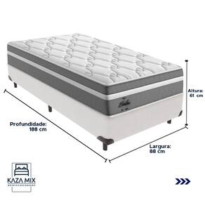 O conforto que sua casa precisa e a qualidade que você merece está na Kazamix! Apresentamos o Colchão Probel Berlim, a escolha ideal para quem busca conforto e qualidade. Com Molas Ensacadas e camada Euro Pillow, ele proporciona suporte individualizado e maciez extra para um sono tranquilo. A espuma D28 oferece durabilidade e conforto, enquanto o tecido em malha e jacquard garante um toque sofisticado e respirabilidade. Além disso, conta com proteções antiácaro e antialérgico, criando um ambiente saudável para o seu descanso. Invista no seu conforto com o Colchão Probel Berlim! Modelo: Berlim Marca: Probel Tamanho: Solteiro Dimensões: 88x188X32 (Largura x Comprimento x Altura) Conforto: Intermediário Sistema: Molas Ensacadas Pillow: Euro Pillow Peso Máximo recomendado: 110 kg (Por pessoa) Proteções: Antiácaro, antialérgico, antifungo, antimofo Garantia: 1 ano pelo FabricanteO conforto que sua casa precisa e a qualidade que você merece está na Kazamix! Eleve o conforto e a sofisticação do seu quarto com a Cama Box! Produzida em madeira de reflorestamento reforçada, a Cama Box combina qualidade, durabilidade e um design elegante, que confere leveza e modernidade ao seu dormitório. Sua estrutura robusta suporta até 150 kg por pessoa, garantindo a sustentação perfeita para o colchão e prolongando a vida útil do produto. Com uma altura ergonômica, ela oferece maior conforto ao deitar e levantar, enquanto o acabamento de alta qualidade se adapta a qualquer estilo de decoração, unindo praticidade e estilo. Não perca tempo! Adquira agora mesmo a sua Cama Box e transforme seu dormitório com conforto e elegância. Marca: KazaMix Modelo: Box Tamanho: Solteiro Dimensões: 88X188X35 (Largura x Comprimento x Altura) Estrutura: Madeira Peso máximo recomendado: 150 kg (Por Pessoa) Altura do Box: 25 cm Altura dos Pés: 10 cm Altura total: 35 cm Garantia: 03 meses Selo Ecologicamente Correto Atenção: Antes de finalizar sua compra, certifique-se de que as dimensões do produto sejam adequadas para serem transportadas pelos elevadores, portas, escadas e corredores de sua residência. Ressaltamos que não nos responsabilizamos pelo transporte do produto por meios específicos, como escadas, guinchos ou içamentos.