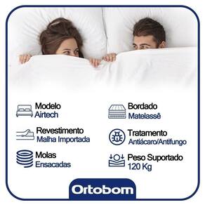 O Colchão De Molas Ensacadas AirTech Ortobom é indicado para pessoas de até 150kg proporcionando conforto firme, o que lhe confere firmeza suficiente para preservar sua coluna durante o sono sem comprometer seu conforto. Fabricado com matérias-primas de alta qualidade e durabilidade, o AirTech Molas Ensacadas Ortobom garante conforto e por muito mais tempo.