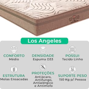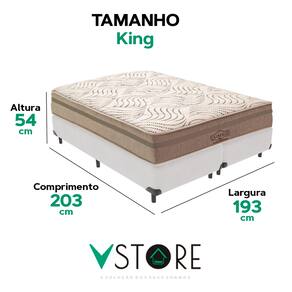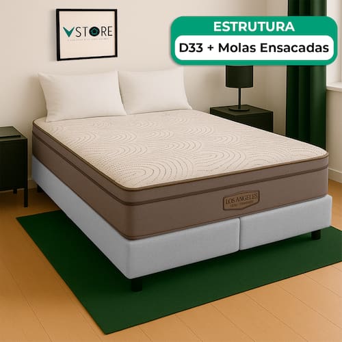 A tecnologia que a sua casa merece está na V-Store! O Conjunto Colchão Los Angeles + Base Box Baú Bravus da V-Store oferece conforto e funcionalidade. O colchão, com molas ensacadas e sistema EPS, garante suporte ideal, conforto térmico e proteção antiácaro. A base box, com amplo espaço de armazenamento, é feita de madeira reflorestada e revestida com tecido resistente, proporcionando praticidade e sofisticação ao seu quarto.Característica Do Colchão: Modelo: Los AngelesMarca: V-StoreTamanho: KingDimensões: 193x28x203 (Largura x Altura x Comprimento)Conforto: MédioSistema: Molas EnsacadasPillow: Não se aplicaPeso Máximo recomendado: 150 kg (Por pessoa)Proteções: Antiácaro, antialérgico, antifungo, antimofoGarantia: 12 Meses (Espuma) / 10 anos ( Conjunto de Molas Ensacadas)Característica Da Base: Marca: V-StoreModelo: BravusCor do Box: BrancoTamanho: KingDimensões: 193x44x203 (Largura x Altura x Comprimento)Estrutura: MadeiraPeso máximo recomendado: 150 kg (Por Pessoa)Altura do Box: 26 cmAltura dos Pés: 6 cmAltura total: 44 cmGarantia: 12 Meses (Estrutura) / 3 meses (Tecido)Selo Ecologicamente CorretoAtenção:- Antes de finalizar sua compra, recomendamos que verifique se as dimensões do produto são adequadas para serem transportadas pelos elevadores, portas, escadas e corredores de sua residência. Ressaltamos que não nos responsabilizamos pelo transporte do produto por meios específicos, como escadas, guinchos ou içamentos.- É possível que hajam leves variações de cor de acordo com o dispositivo que está sendo utilizado como smartphones, computadores, monitores e outros.