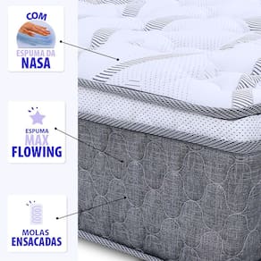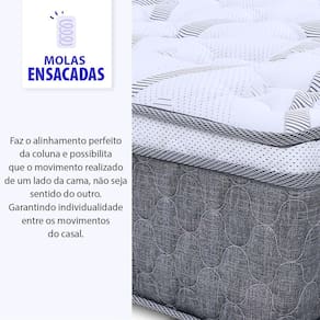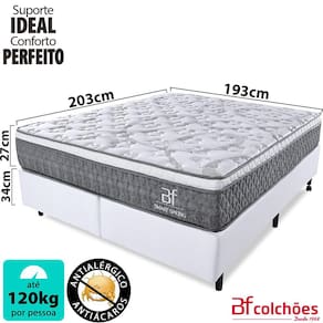 Características do Colchão: - Molas ensacadas individualmente: Propicia que o movimento feito em um lado do colchão não seja sentido em outro, proporcionando individualidade entre os movimentos do casal. - Pillow top: Com camada de Espuma Viscoelástica também conhecida como espuma da nasa, ela irá absorver perfeitamente a pressão causada ao deitar-se, adaptando-se completamente a seu corpo e mantendo-o confortável durante o sono. - Espuma Max Flowing: Tecnologia em conforto exclusiva BF Colchões, sinta fluir todo aconchego da espuma Max Flowing. Conforto perfeito e um sono revigorante. - Suporte de Peso: Até 120 kg por pessoa. - Nível de Conforto: Intermediário - macio. - Tecido: Malha Malibu Ultra macia com bordado em matelasssê, o que oferece um toque mais macio com tratamento antimicrobiano (Anti-Ácaro / Anti-Alergico). - Revestimento: Tecido especial de Linho. - Medidas Colchão: 193cm x 203 cm x 27 cm - Garantia do Colchão: 12 Meses