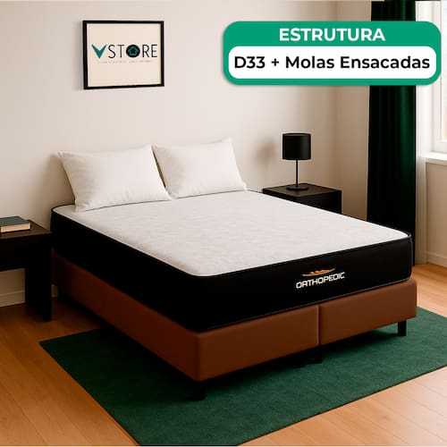 A tecnologia que a sua casa merece está na V-Store! O Conjunto Colchão Orthopedic + Base Box Bravus da V-Store é a união perfeita de conforto e resistência. O colchão, com espuma D33 e suporte extra firme, garante alinhamento ideal e proteção contra ácaros, alergias e fungos. A base box, com estrutura de madeira reflorestada e acabamento em tecido sintético, oferece durabilidade e um design moderno para o seu dormitório.Característica Do Colchão: Modelo: OrthopedicMarca: V-StoreTamanho: KingDimensões: 193x30x203 (Largura x Altura x Comprimento)Conforto: Extra FirmeSistema: EspumaPillow: Não se aplicaPeso Máximo recomendado: 110 kg (Por pessoa)Proteções: Antiácaro, antialérgico, antifungo, antimofoGarantia: 12 Meses (Espuma)Característica Da Base: Marca: V-StoreModelo: BravusCor do Box: MarromTamanho: KingDimensões: 193x44x203 (Largura x Altura x Comprimento)Estrutura: MadeiraPeso máximo recomendado: 150 kg (Por Pessoa)Altura do Box: 26 cmAltura dos Pés: 6 cmAltura total: 44 cmGarantia: 12 Meses (Estrutura) / 3 meses (Tecido)Selo Ecologicamente CorretoAtenção:- Antes de finalizar sua compra, recomendamos que verifique se as dimensões do produto são adequadas para serem transportadas pelos elevadores, portas, escadas e corredores de sua residência. Ressaltamos que não nos responsabilizamos pelo transporte do produto por meios específicos, como escadas, guinchos ou içamentos.- É possível que hajam leves variações de cor de acordo com o dispositivo que está sendo utilizado como smartphones, computadores, monitores e outros.