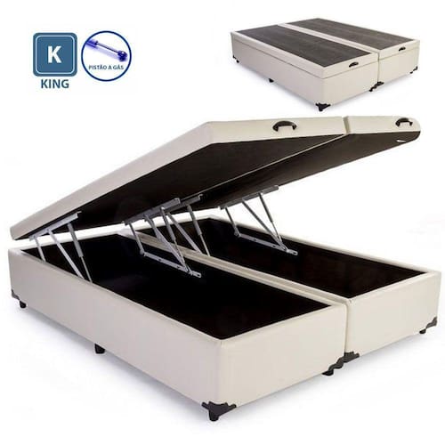 Cama Box King Size Sintético Com Bau Pistão A Gás Bege Bipartido