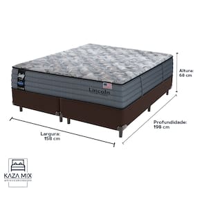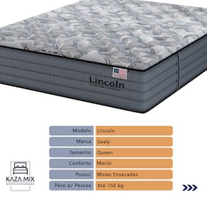 Bem-vindo(a) ao nosso catálogo! Apresentamos a você uma descrição completa sobre esse produto: A marca SealyEntre as personalidades que usam e usaram os colchões da marca Sealy estão a cantora Adele, Rainha Elizabeth II, a apresentadora Ellen DeGeneres e o jogador de basquete LeBron James. Atendendo também os hotéis da Disney, Copacabana Palace, Hard Rock Hotels e outros. Referência na fabricação de colchões de alta qualidade, a empresa foi fundada em 1881. Investindo em tecnologia de ponta e materiais premium para produzir produtos duráveis e confortáveis, é reconhecida por diversos consumidores famosos em todo o mundo. Modelo: LincolnNível de Conforto: MacioSuporte de peso: 300 quilos (150kg por pessoa)Molas: Molas Ensacadas DSS Espuma: Espuma Hipersoft GelAltura: 33 cm Tecido: Malha Margan 365 gO Colchão Lincoln Sealy é o ápice do conforto e sofisticação, criado para quem busca o melhor em qualidade de sono. Este colchão de 33 cm de altura é uma verdadeira obra-prima, combinando a renomada tecnologia de Molas Ensacadas DSS com o suporte adicional da tecnologia Posturepedic. Essa combinação oferece um alinhamento perfeito da coluna e alívio dos pontos de pressão, proporcionando uma experiência de sono revitalizante e tranquila. Com uma camada de espuma Hipersoft Gel, o Colchão Lincoln Sealy eleva o conforto a um novo patamar, garantindo uma sensação de maciez e ajudando a dissipar o calor, mantendo a temperatura ideal durante toda a noite. O tampo em Malha Margan, com 365 g/m², adiciona um toque de frescor e elegância, enquanto a lateral em Jacquard Plano reforça a durabilidade e o visual sofisticado. Além disso, o colchão é equipado com uma camada adicional de fibra siliconada e espuma Soft, com um reforço estratégico no terço central, garantindo suporte extra e conforto incomparável. As bordas firmes ampliam a área útil do colchão, evitando deformações e garantindo que cada centímetro seja aproveitado ao máximo. Com capacidade de suporte de até 150 kg por pessoa, o Colchão Lincoln Sealy não é apenas sinônimo de conforto, mas também de durabilidade e resistência. Eleve sua experiência de sono com este colchão, que combina tecnologia avançada, materiais de alta qualidade e um design elegante, transformando suas noites em momentos de descanso verdadeiramente restauradores. Além de tudo, esse produto acompanha a Cama Box da Kaza Mix e assim se torna um conjunto perfeito para o seu quarto! Marca: Kaza MixCor do Box: MarromTamanho: QueenMaterial dos pés: MadeiraEstrutura: MadeiraPeso máximo recomendado: Até 150kg de cada ladoLargura: 158cmComprimento: 198cmAltura dos pés: 12cmAltura total: 42cmGarantia: 03 mesesSelo Ecologicamente CorretoAtenção: - Antes de finalizar sua compra, recomendamos que verifique se as dimensões do produto são adequadas para serem transportadas pelos elevadores, portas, escadas e corredores de sua residência. Ressaltamos que não nos responsabilizamos pelo transporte do produto por meios específicos, como escadas, guinchos ou içamentos. - É possível que hajam leves variações de cor de acordo com o dispositivo que está sendo utilizado como smartphones, computadores, monitores e outros.