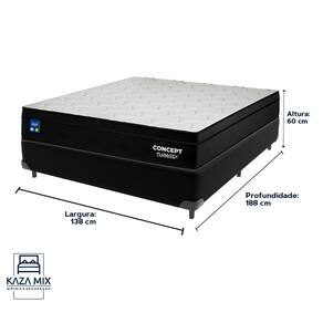 Bem-vindo(a) ao nosso catálogo!Apresentamos a você uma descrição completa sobre esse produto:Fundada em outubro de 1984, a Plumatex se destaca como a mais moderna e bem estruturada empresa do segmento colchoeiro, com cinco fábricas próprias instaladas nos estados de Goiás, Bahia, Paraíba, Rio de Janeiro e Maranhão, e uma fábrica terceirizada em Santa Catarina.Sempre atentos às novas tecnologias, somos especialistas em fabricação e inovação. Produzimos colchões dos sonhos para todos os bolsos, assinados pelas nossas marcas própriasModelo: ConceptNível de Conforto: IntermediárioSuporte de peso: 220 quilos (110 kg por pessoa)Molas: Molas ensacadas individualmentePillow: EuroPillowEspuma: D26Altura: 25 cmTecido: Sarja Winter – 130 g/m² Apresentamos o modelo Concept, uma escolha perfeita para quem busca o equilíbrio ideal entre firmeza e maciez. Com um design minimalista e sofisticado, este colchão combina tecnologia avançada com conforto superior.Equipado com molas ensacadas individualmente, o Concept proporciona um suporte personalizado que se adapta ao seu corpo, enquanto a espuma certificada D26 kg/m³ garante resiliência e um toque suave. O tampo em Sarja Winter oferece conforto térmico e durabilidade, tornando suas noites de sono ainda mais agradáveis.A lateral em Kupon e o pillow INN complementam o design, conferindo um visual moderno e elegante. Com 25 cm de altura, suporte para até 110 kg e detalhes de construção que incluem EPS para estabilidade e TNT 100g para maior aderência, o Concept é a escolha ideal para quem valoriza um descanso confortável e refinado.Descubra o modelo Concept e transforme seu sono em uma experiência de bem-estar incomparável.Além de tudo, esse produto acompanha a Cama Box da Kaza Mix e assim se torna um conjunto perfeito para o seu quarto!Marca: Kaza MixCor do Box: PretoTamanho: CasalMaterial dos pés: MadeiraEstrutura: MadeiraPeso máximo recomendado: Até 150kg de cada ladoLargura: 138cmComprimento: 188cmAltura dos pés: 12cmAltura total: 42cmGarantia: 03 mesesSelo Ecologicamente CorretoAtenção: - Antes de finalizar sua compra, recomendamos que verifique se as dimensões do produto são adequadas para serem transportadas pelos elevadores, portas, escadas e corredores de sua residência. Ressaltamos que não nos responsabilizamos pelo transporte do produto por meios específicos, como escadas, guinchos ou içamentos.- É possível que hajam leves variações de cor de acordo com o dispositivo que está sendo utilizado como smartphones, computadores, monitores e outros.