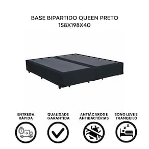Tamanho Queen: 158x198 cm Bipartida: Mais praticidade na hora da entrega e montagem Cor: Preta Tecido: Suede Estrutura reforçada: Suporte firme e durável Revestimento de qualidade: Sofisticação e resistência Compatível com todos os colchões padrão Queen Ideal para apartamentos, escadas estreitas e elevadores pequenos
