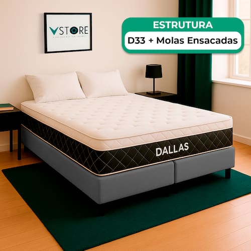 A tecnologia que a sua casa merece está na V-Store! O Conjunto Colchão Dallas e Base Box Bravus oferece a combinação perfeita de conforto, durabilidade e estilo. O Colchão Dallas, com molas ensacadas, espuma D33, Euro Pillow e tecnologia EPS, proporciona excelente suporte e conforto térmico. Já a Base Box Bravus, feita com madeira reflorestada e revestida com tecido sintético, garante resistência, durabilidade e um design sofisticado que complementa qualquer ambiente. Ideal para quem busca praticidade e elegância no quarto. Adquira já a sua Base Box Bravus V-Store e transforme seu dormitório com qualidade e estilo!Característica Do Colchão: Modelo: DallasMarca: V-StoreTamanho: QueenDimensões: 158x20x198 (Largura x Altura x Comprimento)Conforto: MédioSistema: Molas EnsacadasPillow: Euro PillowPeso Máximo recomendado: 150 kg (Por pessoa)Proteções: Antiácaro, antialérgico, antifungo, antimofoGarantia: 12 Meses (Espuma) / 10 anos ( Conjunto de Molas Ensacadas)Característica Da Base: Marca: V-StoreModelo: BravusCor do Box: CinzaTamanho: QueenDimensões: 158x44x198 (Largura x Altura x Comprimento)Estrutura: MadeiraPeso máximo recomendado: 150 kg (Por Pessoa)Altura do Box: 26 cmAltura dos Pés: 6 cmAltura total: 44 cmGarantia: 12 Meses (Estrutura) / 3 meses (Tecido)Selo Ecologicamente CorretoAtenção:- Antes de finalizar sua compra, recomendamos que verifique se as dimensões do produto são adequadas para serem transportadas pelos elevadores, portas, escadas e corredores de sua residência. Ressaltamos que não nos responsabilizamos pelo transporte do produto por meios específicos, como escadas, guinchos ou içamentos.- É possível que hajam leves variações de cor de acordo com o dispositivo que está sendo utilizado como smartphones, computadores, monitores e outros.