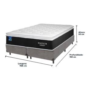 Colchão: Modelo: Magnum; Marca: Plumatex; Tamanho: Queen; Dimensões: 158x198x28cm; (largura x comprimento x altura) Conforto: Molas Ensacadas, Espuma D26, Pillow Top High Tech; Proteções: Antiácaro, antialérgico, antifungo, antimofo; Possui: Malha Chronos 180 g/m; Peso máximo recomendado: até 110Kg (por pessoa); Garantia: 03 meses;