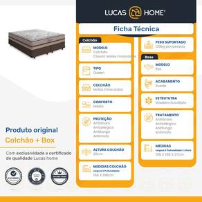Sejam bem-vindos (as) a LUCAS HOME, o Conjunto Cama Box + Colchão de Molas Ensacadas - Anjos - Classic é uma combinação exclusiva da Lucas Home que oferece uma solução completa na aquisição de sua nova cama. O Colchão de Molas Ensacadas - Anjos - Classic é indicado para pessoas de até 120kg proporcionando conforto macio, o que lhe confere conforto extra durante o sono sem comprometer sua coluna. A Base Box é confeccionada com estrutura de madeira 100% reflorestada com tratamentos anticupim e antimofo, proporcionando alta durabilidade e resistência do produto. Possui excelente acabamento em material sintético, e com cantoneiras plásticas para proteção.