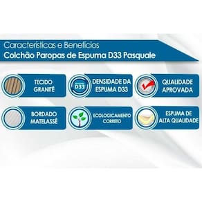 Dimensões(Cm): Comnto(Profundidade): 198cm x Largura: 158cm x Altura: 25cm Tipo de Bordado do Tecido de Revestimento - Matelassê Tipo Tecido de Forração Revestimento - Poliéster - Granitê Tecido com Tratamento - AntiÁcaro e AntiFungo Modo de Utilização - Double Side Tipo de Estrutura do Bloco de Espuma - D33 Camadas Interna do Estofamento de Espuma - Alta Qualidade Peso Máximo Suportado - 110 kg Tipo de Conforto - Macio c/ Firmeza Certificados de Qualidade - Qualidade Aprovada - Qualidade Costa Rica - INMETRO Vantagens Extras do colchão D33 - Ecologicamente Correto Nossa Avaliação - Qualidade Muito Boa Tempo de Garantia - 12 meses