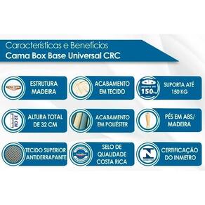 Dimensões(Cm): Comprimento(Profundidade): 198cm x Largura: 158cm x Altura: 33cm Características Gerais da Cama Box - Não acompanha Cantoneira Características Internas Cama Box - Estrutura de Madeira Forração Revestimento da Cama Box - Tecido - Antiderrapante - Poliéster - Tecido de Alta Qualidade Cor da Forração Revestimento Cama Box - Branco Suporte de Peso da Cama Box - 150 Kg Sobre os Pés para Cama Box - Pés foto ilustrativa - Pés Fixos Madeira/ABS Altura dos pés da Cama Box - 12cm Altura da Cama Box com os pés - 32 cm altura Outras Vantagens da Cama Box - Como Escolher o Colchão do seu Conjunto Box - Outras Informações da Cama Box Base Sobre a Cama Box Base - Informações da Cama Box Base - Vantagens Tempo de Garantia da Cama Box - 3 meses Certificação de Qualidade - Qualidade Aprovada - Selo Ecologicamente Correto - Garantia de Qualidade Costa Rica - Certificação de Segurança Nossa Avaliação da Cama Box - Qualidade Muito Boa