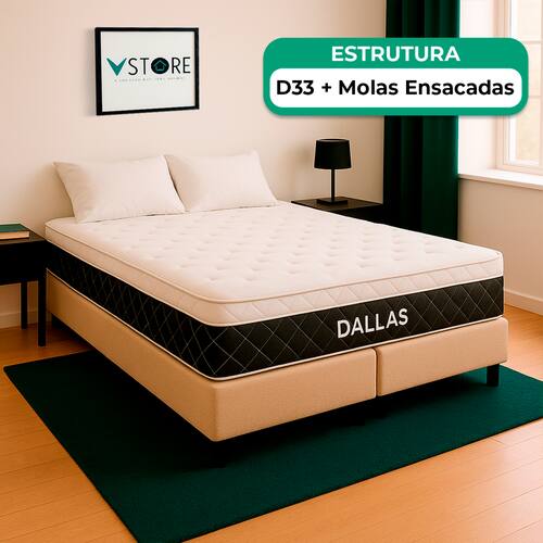 A tecnologia que a sua casa merece está na V-Store! O Conjunto Colchão Dallas e Base Box Bravus oferece a combinação perfeita de conforto, durabilidade e estilo. O Colchão Dallas, com molas ensacadas, espuma D33, Euro Pillow e tecnologia EPS, proporciona excelente suporte e conforto térmico. Já a Base Box Bravus, feita com madeira reflorestada e revestida com tecido sintético, garante resistência, durabilidade e um design sofisticado que complementa qualquer ambiente. Ideal para quem busca praticidade e elegância no quarto. Adquira já a sua Base Box Bravus V-Store e transforme seu dormitório com qualidade e estilo!Característica Do Colchão: Modelo: DallasMarca: V-StoreTamanho: QueenDimensões: 158x20x198 (Largura x Altura x Comprimento)Conforto: MédioSistema: Molas EnsacadasPillow: Euro PillowPeso Máximo recomendado: 150 kg (Por pessoa)Proteções: Antiácaro, antialérgico, antifungo, antimofoGarantia: 12 Meses (Espuma) / 10 anos ( Conjunto de Molas Ensacadas)Característica Da Base: Marca: V-StoreModelo: BravusTamanho: QueenDimensões: 158x44x198 (Largura x Altura x Comprimento)Estrutura: MadeiraPeso máximo recomendado: 150 kg (Por Pessoa)Altura do Box: 26 cmAltura dos Pés: 6 cmAltura total: 44 cmGarantia: 12 Meses (Estrutura) / 3 meses (Tecido)Selo Ecologicamente CorretoAtenção:- Antes de finalizar sua compra, recomendamos que verifique se as dimensões do produto são adequadas para serem transportadas pelos elevadores, portas, escadas e corredores de sua residência. Ressaltamos que não nos responsabilizamos pelo transporte do produto por meios específicos, como escadas, guinchos ou içamentos.- É possível que hajam leves variações de cor de acordo com o dispositivo que está sendo utilizado como smartphones, computadores, monitores e outros.