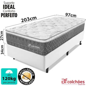 Características do Colchão: - Molas ensacadas individualmente: Propicia que o movimento feito em um lado do colchão não seja sentido em outro, proporcionando individualidade entre os movimentos do casal. - Pillow top: Com camada de Espuma Viscoelástica também conhecida como espuma da nasa, ela irá absorver perfeitamente a pressão causada ao deitar-se, adaptando-se completamente a seu corpo e mantendo-o confortável durante o sono. - Espuma Max Flowing: Tecnologia em conforto exclusiva BF Colchões, sinta fluir todo aconchego da espuma Max Flowing. Conforto perfeito e um sono revigorante. - Suporte de Peso: Até 120 kg por pessoa. - Nível de Conforto: Intermediário - macio. - Tecido: Malha Malibu Ultra macia com bordado em matelasssê, o que oferece um toque mais macio com tratamento antimicrobiano (Anti-Ácaro / Anti-Alergico). - Revestimento: Tecido especial de Linho. - Medidas Colchão:97 cm x 203 cm x 27 cm - Garantia do Colchão: 12 Meses
