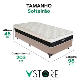A tecnologia que a sua casa merece está na V-Store! O Conjunto Colchão Dallas e Base Box Bravus oferece a combinação perfeita de conforto, durabilidade e estilo. O Colchão Dallas, com molas ensacadas, espuma D33, Euro Pillow e tecnologia EPS, proporciona excelente suporte e conforto térmico. Já a Base Box Bravus, feita com madeira reflorestada e revestida com tecido sintético, garante resistência, durabilidade e um design sofisticado que complementa qualquer ambiente. Ideal para quem busca praticidade e elegância no quarto. Adquira já a sua Base Box Bravus V-Store e transforme seu dormitório com qualidade e estilo!Característica Do Colchão: Modelo: DallasMarca: V-StoreTamanho: SolteirãoDimensões: 96x20x203 (Largura x Altura x Comprimento)Conforto: MédioSistema: Molas EnsacadasPillow: Euro PillowPeso Máximo recomendado: 150 kg (Por pessoa)Proteções: Antiácaro, antialérgico, antifungo, antimofoGarantia: 12 Meses (Espuma) / 10 anos ( Conjunto de Molas Ensacadas)Característica Da Base: Marca: V-StoreModelo: BravusTamanho: SolteirãoDimensões: 96x44x203 (Largura x Altura x Comprimento)Estrutura: MadeiraPeso máximo recomendado: 150 kg (Por Pessoa)Altura do Box: 26 cmAltura dos Pés: 6 cmAltura total: 44 cmGarantia: 12 Meses (Estrutura) / 3 meses (Tecido)Selo Ecologicamente CorretoAtenção:- Antes de finalizar sua compra, recomendamos que verifique se as dimensões do produto são adequadas para serem transportadas pelos elevadores, portas, escadas e corredores de sua residência. Ressaltamos que não nos responsabilizamos pelo transporte do produto por meios específicos, como escadas, guinchos ou içamentos.- É possível que hajam leves variações de cor de acordo com o dispositivo que está sendo utilizado como smartphones, computadores, monitores e outros.