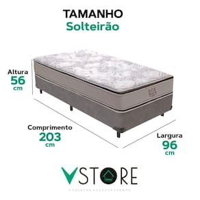 Marca: V-Store Modelo: Bravus Tamanho Solteirão Dimensões: 96x44x203 (Largura x Altura x Comprimento) Estrutura: Madeira Peso máximo recomendado: 150 kg (Por Pessoa) Altura do Box: 26 cm Altura dos Pés: 6 cm Altura total: 44 cm Garantia: 12 Meses (Estrutura) / 3 meses (Tecido) Selo Ecologicamente Correto