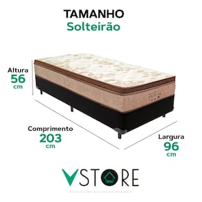 A tecnologia que a sua casa merece está na V-Store! A cama Box da V-Store é a escolha perfeita para quem busca conforto e praticidade. Com o colchão Victory Solteiro, você garante noites de sono tranquilas, com seu toque macio e sistema de molas ensacadas que proporcionam suporte adequado e independência de movimentos. O Pillow Euro Pillow oferece suavidade extra, e a tecnologia EPS adiciona resistência e durabilidade ao colchão. Além disso, ele possui proteções contra ácaros, fungos, mofo e alergias, promovendo um ambiente de sono mais saudável. O colchão suporta até 150 kg por pessoa e vem com garantia de 12 meses.A base box da V-Store é feita com materiais resistentes e de fácil manutenção, ideal para quem busca praticidade e um design simples e elegante. Com 38 cm de altura, ela oferece a estabilidade necessária para o seu colchão, completando o conjunto perfeito para o seu quarto. Adquira a cama Box da V-Store e experimente o conforto e a qualidade que sua casa merece!Característica Do Colchão: Modelo: VictoryMarca: V-StoreTamanho: SolteirãoDimensões: 96x30x203 (Largura x Altura x Comprimento)Conforto: MédioSistema: Molas EnsacadasPillow: Euro PillowPeso Máximo recomendado: 150 kg (Por pessoa)Proteções: Antiácaro, antialérgico, antifungo, antimofoGarantia: 12 Meses (Espuma) / 10 anos ( Conjunto de Molas Ensacadas)Característica Da Base: Marca: V-StoreModelo: BravusTamanho: SolteirãoDimensões: 96x44x203 (Largura x Altura x Comprimento)Estrutura: MadeiraPeso máximo recomendado: 150 kg (Por Pessoa)Altura do Box: 26 cmAltura dos Pés: 6 cmAltura total: 44 cmGarantia: 12 Meses (Estrutura) / 3 meses (Tecido)Selo Ecologicamente CorretoAtenção:- Antes de finalizar sua compra, recomendamos que verifique se as dimensões do produto são adequadas para serem transportadas pelos elevadores, portas, escadas e corredores de sua residência. Ressaltamos que não nos responsabilizamos pelo transporte do produto por meios específicos, como escadas, guinchos ou içamentos.- É possível que hajam leves variações de cor de acordo com o dispositivo que está sendo utilizado como smartphones, computadores, monitores e outros.