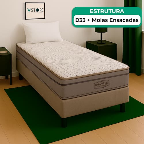 A tecnologia que a sua casa merece está na V-Store! O Conjunto Colchão Los Angeles + Base Box Baú Bravus da V-Store oferece conforto e funcionalidade. O colchão, com molas ensacadas e sistema EPS, garante suporte ideal, conforto térmico e proteção antiácaro. A base box, com amplo espaço de armazenamento, é feita de madeira reflorestada e revestida com tecido resistente, proporcionando praticidade e sofisticação ao seu quarto.Característica Do Colchão: Modelo: Los AngelesMarca: V-StoreTamanho: SolteiroDimensões: 88x28x188 (Largura x Altura x Comprimento)Conforto: MédioSistema: Molas EnsacadasPillow: Não se aplicaPeso Máximo recomendado: 150 kg (Por pessoa)Proteções: Antiácaro, antialérgico, antifungo, antimofoGarantia: 12 Meses (Espuma) / 10 anos ( Conjunto de Molas Ensacadas)Característica Da Base: Marca: V-StoreModelo: BravusCor do Box: BegeTamanho: SolteiroDimensões: 88x44x188 (Largura x Altura x Comprimento)Estrutura: MadeiraPeso máximo recomendado: 150 kg (Por Pessoa)Altura do Box: 26 cmAltura dos Pés: 6 cmAltura total: 44 cmGarantia: 12 Meses (Estrutura) / 3 meses (Tecido)Selo Ecologicamente CorretoAtenção:- Antes de finalizar sua compra, recomendamos que verifique se as dimensões do produto são adequadas para serem transportadas pelos elevadores, portas, escadas e corredores de sua residência. Ressaltamos que não nos responsabilizamos pelo transporte do produto por meios específicos, como escadas, guinchos ou içamentos.- É possível que hajam leves variações de cor de acordo com o dispositivo que está sendo utilizado como smartphones, computadores, monitores e outros.