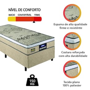 A cama box de solteiro Fort foi desenvolvida, especialmente, pensando no seu bem-estar! Possui espuma de alta qualidade em sua composição, trazendo conforto e durabilidade, além de ser um produto firme e resistente. Conta com garantia total de descanso e qualidade de vida. Suporta até 150kg por pessoa garantindo suporte adequado para o corpo e maior qualidade no descanso diário. Perfeito para quem busca um colchão de espuma com excelente desempenho e conforto. O box conta com acabamento em tecido reforçado, e é excelente para você que busca um produto moderno e prático. Possui estrutura resistente, confeccionado com materiais de qualidade garantindo maior durabilidade
