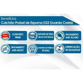 Dimensões(Cm): Comprimento(Profundidade): 188cm x Largura: 88cm x Altura: 17cm Tecido com Tratamento do Colchão - AntiÁcaro e AntiFungo Bordado do Revestimento do Colchão - Matelassê Forração Revestimento do Colchão - Poliéster Modo de Utilização do Colchão - Double Side Camadas Interna do Estofamento de Espuma do Colchão - Alta Qualidade Densidade da Espuma do Colchão - D33 Nível de Firmeza do Colchão - Firme Peso Máximo Suportado do Colchão - 110 kg Certificação de Qualidade do Colchão - Qualidade Aprovada - INMETRO - Qualidade Costa Rica Nossa Avaliação do Colchão - Qualidade Boa Tempo de Garantia do Colchão - 12 meses