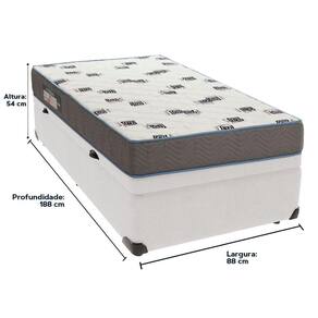 Base Box com Baú: Marca: Ortobom; Cor do Box: Branco; Material dos pés: Madeira; Estrutura: Madeira; Peso máximo recomendado: até 150kg de cada lado; Altura do Box: 25cm; Altura dos pés: 10cm; Altura total: 35cm; Garantia: 03 meses; Selo Ecologicamente Correto.