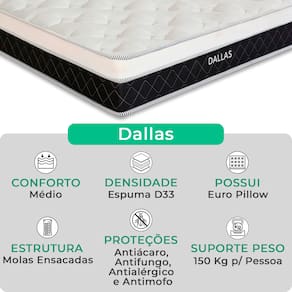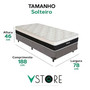 A tecnologia que a sua casa merece está na V-Store! O Conjunto Colchão Dallas e Base Box Bravus oferece a combinação perfeita de conforto, durabilidade e estilo. O Colchão Dallas, com molas ensacadas, espuma D33, Euro Pillow e tecnologia EPS, proporciona excelente suporte e conforto térmico. Já a Base Box Bravus, feita com madeira reflorestada e revestida com tecido sintético, garante resistência, durabilidade e um design sofisticado que complementa qualquer ambiente. Ideal para quem busca praticidade e elegância no quarto. Adquira já a sua Base Box Bravus V-Store e transforme seu dormitório com qualidade e estilo!Característica Do Colchão: Modelo: DallasMarca: V-StoreTamanho: SolteiroDimensões: 78x20x188 (Largura x Altura x Comprimento)Conforto: MédioSistema: Molas EnsacadasPillow: Euro PillowPeso Máximo recomendado: 150 kg (Por pessoa)Proteções: Antiácaro, antialérgico, antifungo, antimofoGarantia: 12 Meses (Espuma) / 10 anos ( Conjunto de Molas Ensacadas)Característica Da Base: Marca: V-StoreModelo: BravusTamanho: SolteiroDimensões: 78x44x188 (Largura x Altura x Comprimento)Estrutura: MadeiraPeso máximo recomendado: 150 kg (Por Pessoa)Altura do Box: 26 cmAltura dos Pés: 6 cmAltura total: 44 cmGarantia: 12 Meses (Estrutura) / 3 meses (Tecido)Selo Ecologicamente CorretoAtenção:- Antes de finalizar sua compra, recomendamos que verifique se as dimensões do produto são adequadas para serem transportadas pelos elevadores, portas, escadas e corredores de sua residência. Ressaltamos que não nos responsabilizamos pelo transporte do produto por meios específicos, como escadas, guinchos ou içamentos.- É possível que hajam leves variações de cor de acordo com o dispositivo que está sendo utilizado como smartphones, computadores, monitores e outros.