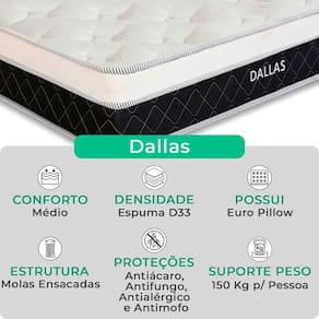 O Conjunto Colchão Dallas e Base Box Bravus oferece a combinação perfeita de conforto, durabilidade e estilo. O Colchão Dallas, com molas ensacadas, espuma D33, Euro Pillow e tecnologia EPS, proporciona excelente suporte e conforto térmico. Já a Base Box Bravus, feita com madeira reflorestada e revestida com tecido sintético, garante resistência, durabilidade e um design sofisticado que complementa qualquer ambiente. Ideal para quem busca praticidade e elegância no quarto.