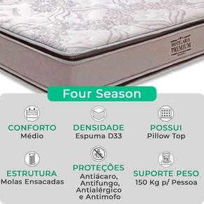 O Conjunto Colchão Four Seasons e Base Box Bravus oferece o equilíbrio perfeito entre conforto e funcionalidade. O colchão, com molas ensacadas, pillow top e EPS, garante excelente suporte e conforto térmico, ideal para casais. Já a base, feita de madeira reflorestada e revestida em tecido sintético, oferece durabilidade e praticidade, com amplo espaço para armazenamento.