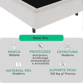 A tecnologia que a sua casa merece está na V-Store!A Base Box Bravus da V-Store une funcionalidade e elegância, sendo a escolha perfeita para quem busca praticidade e durabilidade. Feita com madeira reflorestada, ela oferece excelente sustentação para o seu colchão, enquanto seu revestimento em tecido sintético garante resistência e facilidade de manutenção. Seu design compacto e sofisticado complementa a decoração do quarto com estilo.Com capacidade para 150 kg por pessoa e Selo Ecologicamente Correto, a Base Box Bravus oferece resistência, sustentabilidade e versatilidade para o seu ambiente.Adquira já a sua Base Box Bravus V-Store e transforme seu dormitório com qualidade e estilo!CARACTERÍSTICAS DO PRODUTOMarca: V-StoreModelo: BravusCor do Box: BrancoTamanho: ViúvoDimensões: 128x44x188 (Largura x Altura x Comprimento)Estrutura: MadeiraPeso máximo recomendado: 150 kg (Por Pessoa)Altura do Box: 26 cmAltura dos Pés: 6 cmAltura total: 44 cmGarantia: 12 Meses (Estrutura) / 3 meses (Tecido)Selo Ecologicamente CorretoAtenção:- Antes de finalizar sua compra, recomendamos que verifique se as dimensões do produto são adequadas para serem transportadas pelos elevadores, portas, escadas e corredores de sua residência. Ressaltamos que não nos responsabilizamos pelo transporte do produto por meios específicos, como escadas, guinchos ou içamentos.- É possível que hajam leves variações de cor de acordo com o dispositivo que está sendo utilizado como smartphones, computadores, monitores e outros.