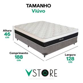 A tecnologia que a sua casa merece está na V-Store! O Conjunto Colchão Dallas e Base Box Bravus oferece a combinação perfeita de conforto, durabilidade e estilo. O Colchão Dallas, com molas ensacadas, espuma D33, Euro Pillow e tecnologia EPS, proporciona excelente suporte e conforto térmico. Já a Base Box Bravus, feita com madeira reflorestada e revestida com tecido sintético, garante resistência, durabilidade e um design sofisticado que complementa qualquer ambiente. Ideal para quem busca praticidade e elegância no quarto. Adquira já a sua Base Box Bravus V-Store e transforme seu dormitório com qualidade e estilo!Característica Do Colchão: Modelo: DallasMarca: V-StoreTamanho: ViuvoDimensões: 128x20x188 (Largura x Altura x Comprimento)Conforto: MédioSistema: Molas EnsacadasPillow: Euro PillowPeso Máximo recomendado: 150 kg (Por pessoa)Proteções: Antiácaro, antialérgico, antifungo, antimofoGarantia: 12 Meses (Espuma) / 10 anos ( Conjunto de Molas Ensacadas)Característica Da Base: Marca: V-StoreModelo: BravusTamanho: ViúvoDimensões: 128x44x188 (Largura x Altura x Comprimento)Estrutura: MadeiraPeso máximo recomendado: 150 kg (Por Pessoa)Altura do Box: 26 cmAltura dos Pés: 6 cmAltura total: 44 cmGarantia: 12 Meses (Estrutura) / 3 meses (Tecido)Selo Ecologicamente CorretoAtenção:- Antes de finalizar sua compra, recomendamos que verifique se as dimensões do produto são adequadas para serem transportadas pelos elevadores, portas, escadas e corredores de sua residência. Ressaltamos que não nos responsabilizamos pelo transporte do produto por meios específicos, como escadas, guinchos ou içamentos.- É possível que hajam leves variações de cor de acordo com o dispositivo que está sendo utilizado como smartphones, computadores, monitores e outros.