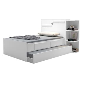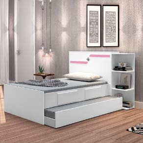 A Cama Hortencia agrega em um único produto funcionalidade e elegância. Além do estrado auxiliar com roldanas para deslocamento, a cama possui três nichos na lateral da cabeceira e duas gavetas integradas na lateral do estrado, detalhe do painel flex podendo ser nas cores branca e ;lilás. ;Também conta com seu ;baú na cabeceira com tampo de abrir, que pode ser utilizado para acomodar travesseiro e roupas de cama por exemplo. Produto estruturado em MDF/MDP com pintura UV e acabamento brilho. Acomoda colchão 0,88m x 1,88m.