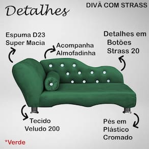 O Divã Cama Caminha Pet Veludo, é uma peça de mobiliário especialmente projetada para oferecer conforto e aconchego ao seu pet de estimação. Conta com uma espuma D23 super macia, que garante que seu pet tenha o suporte necessário para se sentir confortável, oferecendo um local aconchegante e macio para descansar e relaxar. Feito em uma estrtura toda em Madeira de Eucalipto e MDF modelado, muito resistente e segura. Divã produzido no tecido é veludo 200, resistente e de fácil limpeza, conta também com detalhes de botões de strass que são um toque de luxo no design do designer, adicionando um brilho sutil e elegante, deixando um ambiente ainda mais sofisticado para seu lar e seu pet. Os 04 pés são em plástico cromado, que fornecem estabilidade ao divã, e também o elevam ligeiramente do chão, o que pode ser benéfico para a limpeza do ambiente. Este produto chegará na sua casa separado em 01 volume.