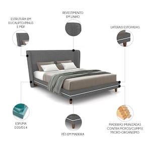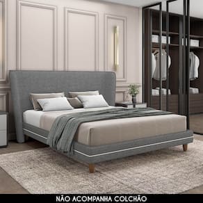 Características do Produto Material da estrutura: Madeira de Eucalipto/MDF 6mm. Densidade da Espuma: Espuma D-20/D-14. Revestimento: Linho. Peso Suportado: 300 Kg distribuídos. Possui Pés: Sim. Material dos Pés: Madeira. Altura dos Pés: 13cm. Possui Rodízios: Não. É Bipartido: Sim. Acompanha Colchão: Não. Acompanha Cabeceira: Sim. Diferenciais: - Design moderno. - Imunização contra mofo, cupim e micro-organismos. - Cabeceira estofada com espuma D-20 na estrutura e D-14 nos adornos laterais. - Cama com lateral estofada. - Pés de madeira. Sistema de Montagem: Parafusos. Manual de Montagem: Não. Complexidade da Montagem: Baixa. Conteúdo da Embalagem: 1 Cama. Volumes: 3 Volumes. Garantia do Fabricante: 90 dias contra defeitos de fabricação. Montagem: Recomendamos que seja feita por um profissional. Recomendação de limpeza: Utilize pano levemente úmido. As dimensões do estofado estão sujeitas a uma variação de até 3 cm. A tonalidade do produto pode apresentar pequenas diferenças devido às variações de lote do tecido.