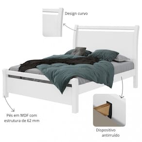 Caracteristicas: Estrutura em MDF/MDP Pes em MDF com espessura de 62mm Barras laterais em MDF de 25mm Estrado em MDF de 6mm Ideal para colchoes de 1380mm 5 Travessoes Dispositivo antirruido