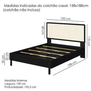 Cama Casal 27055 combina design escandinavo com praticidade para o dia a dia. Estrutura em MDP (15/25mm) e acabamento em pintura BP. No estilo minimalista, é composta por aplique de tela sintética (PVC com poliéster), pés em madeira maciça eucalipto (centrais em MDP 25mm) e furação extra na cabeceira para ajuste de altura. Medidas indicadas do colchão casal 138x188cm (não acompanha colchão). Produto entregue em 3 volumes.