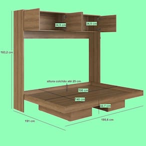 Otimizar espaços abertos é uma das metas da Art In Móveis, por isso criamos a Cama Casal Articulável Horizontal HANOVER. Este produto foi produzido em excelente material MDP, com acabamento Finish Foil Acetinado, que garante maior resistência e qualidade ao seu móvel. A essência de criar soluções que trazem mais conforto à sua vida é o grande diferencial dos produtos Art In Móveis. Cada nova ideia é uma mistura de criatividade, funcionalidade e muita dedicação. Produto Montado: Sim Acabamento da Porta: Finish Foil Acabamento dos Pés: Finish Foil Acompanha Cama Auxiliar: Não Acompanha Colchão: Não Altura do Estrado até o Chão: 24,4 cm Altura do Estrado Superior até o Chão: 26.0000 Altura dos Pés: 22,5 cm Altura Máxima dos Pés: 22.5000 Ambiente Principal: Quarto codigo_ean: 7909903974988 Complexidade da Montagem: Baixa: pode ser montado por uma pessoa sozinha Cor: Mel Cor do Produto: Mel Cor Flex: Não Escala de Brilho: Semi-Brilho Escala de Brilho da Porta: Semi-Brilho Extensível: Não Informações Complementares: 12 Sapatas Plásticas Itens Inclusos: 1 Cama Articulável e Manual de Montagem Linha ou Coleção: Camas Articuláveis Manual de Montagem e Instalação: https://product-hub-prd.madeiramadeira.com.br/960176/documents/eec9e99f-3389-4e09-a23d-7886d134d8fb247238022217291944483422.pdf Marca: Art in Móveis Material da Porta: MDP Material do Estrado: MDP Material dos Pés: MDP Material Principal: MDP Montagem Flex: Não Necessita Montagem: Sim Origem do Produto: Nacional Permite a Utilização de Cama Auxiliar: Não Peso: 86,6 kg Peso Suportado por cada cama: 200.0000 Possui Baú: Não Possui Escrivaninha: Não Possui Espelhos: Não Possui Gavetas: Não Possui Grade: Não Possui Nichos: 02 Possui Pés: 02 Possui Portas: Sim Possui Prateleiras: Não Possui Rodízio: Não Quantidade de Portas: 04 Recomendações de Uso, Manutenção e Limpeza: Deve ser feita com pano macio e seco ou levemente umedecido com água e sabão neutro. Não devem ser utilizados abrasivos como palha de aço e objetos cortantes. Sapatas Niveladoras: Não Sistema de Montagem: Parafusos e Minifix Tamanho da Cama: Casal Tamanho do Colchão Indicado (L x C): 138cm x 188cm Tipo de Cama: Convencional Tipo de Colchão: Casal Tipo de Dobradiça/Corrediça da Porta: Metálica Tipo de Estrado: Fixo Tipo de Porta: Bater Tipo de Puxador da Porta: Embutido Trava de Segurança: Sim