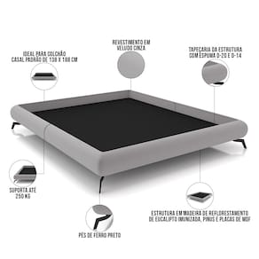 Características: Estrutura em madeira de reflorestamento de eucalipto imunizada contra mofo, cupim e micro-organismos, pinus e placas de MDF. Revestimento em Veludo na cor Cinza. Tapeçaria da estrutura com espuma D-20 e D-14. Ideal para colchão casal padrão de 138 x 188 cm. Não acompanha colchão e cabeceira. Pés de ferro preto. Peso suportado: Até 250 kg.