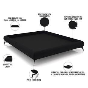 Características: Estrutura em madeira de reflorestamento de eucalipto imunizada contra mofo, cupim e micro-organismos, pinus e placas de MDF. Revestimento em Veludo na cor Preto. Tapeçaria da estrutura com espuma D-20 e D-14. Ideal para colchão casal padrão de 138 x 188 cm. Não acompanha colchão e cabeceira. Pés de ferro preto. Peso suportado: Até 250 kg.