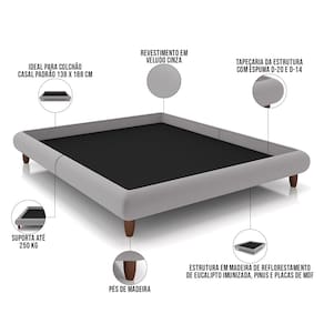 Características: Estrutura em madeira de reflorestamento de eucalipto imunizada contra mofo, cupim e micro-organismos, pinus e placas de MDF. Revestimento em Veludo na cor Cinza. Tapeçaria da estrutura com espuma D-20 e D-14. Ideal para colchão casal padrão 138 x 188 cm. Não acompanha colchão e cabeceira. Pés de madeira. Peso suportado: Até 250 kg.