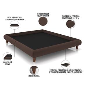 Características: Estrutura em madeira de reflorestamento de eucalipto imunizada contra mofo, cupim e micro-organismos, pinus e placas de MDF. Revestimento em Veludo na cor Marrom. Tapeçaria da estrutura com espuma D-20 e D-14. Ideal para colchão casal padrão 138 x 188 cm. Não acompanha colchão e cabeceira. Pés de madeira. Peso suportado: Até 250 kg.