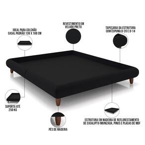 Características: Estrutura em madeira de reflorestamento de eucalipto imunizada contra mofo, cupim e micro-organismos, pinus e placas de MDF. Revestimento em Veludo na cor Preto. Tapeçaria da estrutura com espuma D-20 e D-14. Ideal para colchão casal padrão 138 x 188 cm. Não acompanha colchão e cabeceira. Pés de madeira. Peso suportado: Até 250 kg.