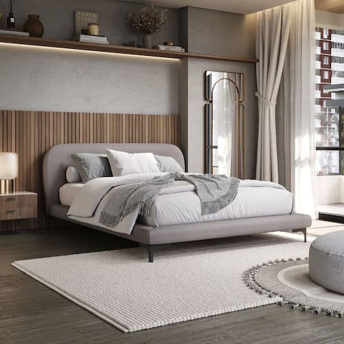 Cama Estofada Casal com Cabeceira Estilo Moderna Cor Cinza;