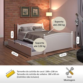 Produto desenvolvido com madeira de Pinus de reflorestamento 100% maciça e MDF, ecologicamente correta. Esse produto de alta resistência e grande performance foi desenvolvido para o cliente que procura uma cama que suporte 240kg . E também conta com uma cama auxiliar.