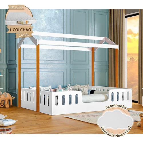 Cama Casal com Colchão Casinha Montessoriana Ágatha Branco/amêndoa Incluso Luminária